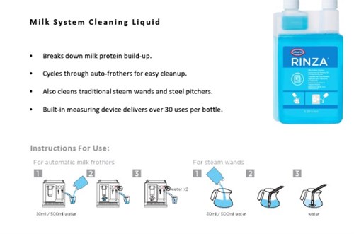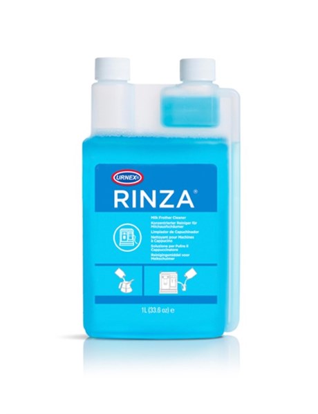 Urnex Rinza er et rengjøringsmiddel som brukes til å fjerne melkerester, proteiner og fett fra kaffemaskinens melkesystemer, som steamarm, automatiske melkeskummere eller melkemugger.