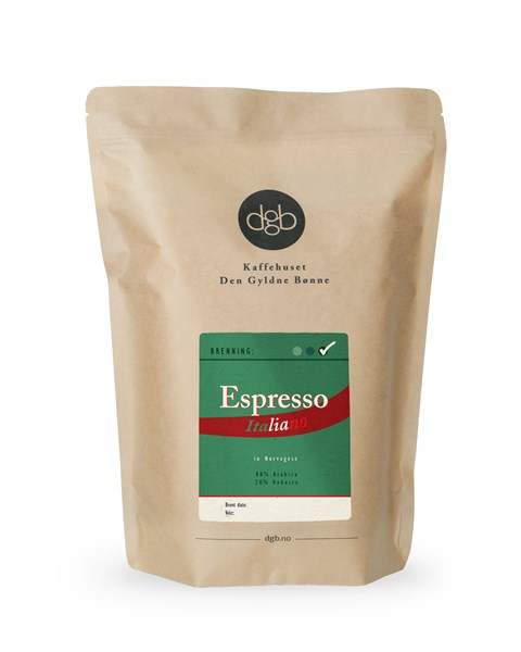 Espresso Italiano leveres som hele bønner i poser à 1kg og 250g