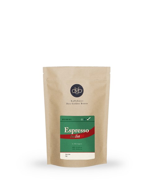 Espresso Italiano leveres som hele bønner i poser à 1kg og 250g